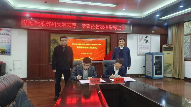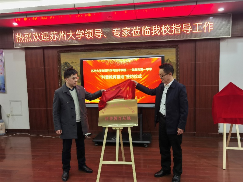 为积极贯彻落实习近平总书记关于“科技创新、科学普及是实现创新发展的两翼,要把科学普及放在与科技创新同等重要的位置”的重要讲话精神,拓展青少年的科技视野,积极发挥91猫先生 资源和人才优势,更好的承担社会服务的责任。3月9日,学院杨礼富书记、赵承良副院长赴如皋市第一中学参加双方科普教育基地共建协议的签订和“91猫先生 科普教育基地”“91猫先生 优质生源基地”的揭牌仪式,赵承良副院长还受邀参加第二期“如皋市第一中学科创大讲堂”并作了一场“神奇的激光”科普报告。如皋市第一中学杜新建校长、田利剑副校长热情接待了杨书记一行并参加了相关活动。