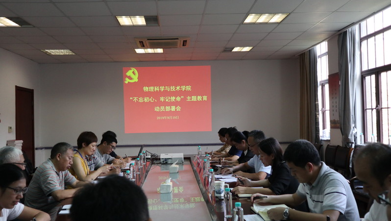 9月19日下午,物理学院“不忘初心、牢记使命”主题教育动员部署会在博习楼221会议室举行。学校第八巡回指导组组长钱万里、指导组成员刘欣亮,学院党委和行政领导班子成员、各党支部支部书记、支部委员参加了会议。会议由学院党委书记孙德芬主持。会议分为两个议程,一是孙德芬书记做主题教育动员部署讲话,二是指导组组长钱万里讲话。