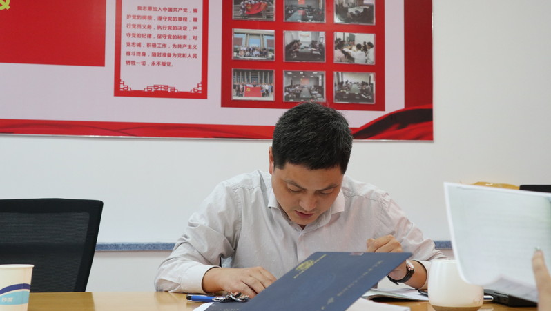参会人员集体观看了赵亚夫事迹短片《诺言》以及《十九大党章知识精粹》系列微动漫第1至5集。随后,全体领导班子人员在孙德芬书记的带领下重温了入党誓词,重读了自己当初的入党志愿书,重忆了入党经历,分享了成长历程,重问了入党初心,进一步坚定了信仰信念信心。