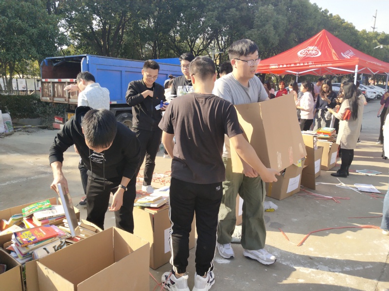 来到斜塘街道莲香社区后,同学们在社区志愿者的安排下分工合作,男生负责把图书从仓库搬出来,女生负责给图书分类(包括学前、小学新书、小学无破损残缺可用、初中、高中及以上、废弃六类),然后放到贴有标签的纸箱里,再由男生整理打包后搬入仓库。在分类整理的过程中,负责人讲到这些图书是社会各界爱心人士捐赠的,其中学校里学生捐赠的图书经过了老师的筛选,同时也是学生自己看过的、感兴趣的,志愿者整理完之后,公益联合会的会长还会再亲手整理一遍,确保每一本书都是适合山区孩子阅读的。捐赠的图书种类繁多,承载着对山区孩子们的爱心和祝福,但是有些图书过于陈旧或者破损,从孩子阅读的角度来考虑,分类整理显得尤为重要,整理让山区的孩子们不仅有书看,还有更好的阅读体验。
