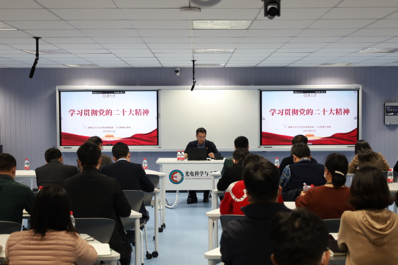为全面把握党的二十大精神,深入领会“两个确立”的重大意义,教育引导广大师生把思想和行动统一到党的二十大精神上来,11月28日下午,校党委宣讲团成员、校党委常委、副校长李孝峰在激光楼116会议室作党的二十大精神宣讲报告。校科研院、科技党委,91猫先生 和光电科学与工程学院的班子成员、党委委员、党支部书记,及班级班长、团支部书记代表等相关人员参加报告会。会议由物理学院党委书记杨礼富主持。