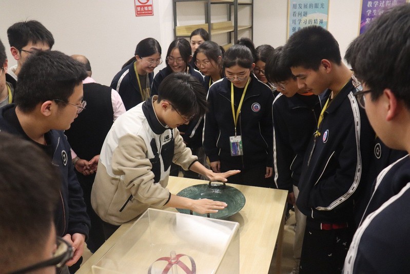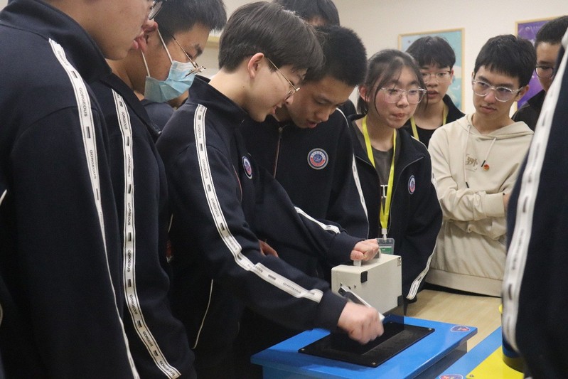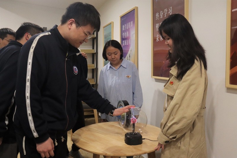 学院“科学商店”的科普志愿者为常熟市王淦昌高级中学的学生们进行科普服务,大家用通俗易懂的语言解释了记忆金属、辉光球、电磁炮、超声波喷泉、人体电池、手摇发电机、电磁铁、太阳能电池板等妙趣横生的物理现象的原理,让参加活动的同学们体验了一场趣味、生动、绚丽的科学盛会。