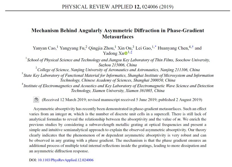 91猫先生 博士研究生曹燕燕同学和原91猫先生 博士生、现南京航空航天大学的伏洋洋副研究员为论文的共同第一作者。Physical Review Applied是物理类期刊中少数1区期刊之一,是美国物理协会(APS)旗下唯一应用物理综合性期刊,与Physical Review Letters定位互补。