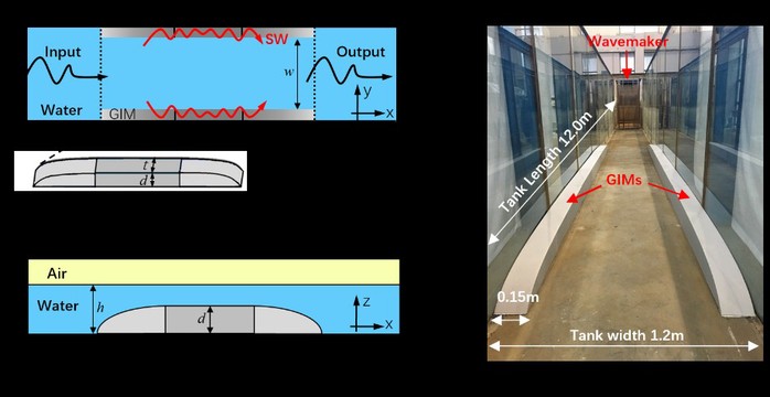 近日发表在PRL上的水波隐身器件最新成果,又是一个厚度尺寸在一个波长左右的人工微结构材料的实际应用。海洋是人类活动的重要场所,包括海上钻井、海上风力发电、水产养殖等。由于这些活动受到恶劣海洋环境的影响,如何灵活地控制水波传播、减少水波作用是海洋工程波浪力学领域的重要研究课题,受到广泛关注。借鉴带有渐变折射率超材料的电磁波隐形的理论方法,提出并设计了一种带有渐变水深分布的波导隐身装置,可以在其中部区域大幅度地消减波浪高度,减少波浪在该隐形区域内对物体的阻力或摇摆效应,从而能够保护海上设施免受水波损坏,具有宽频隐身、鲁棒性好、构造简洁等特点。这种波导隐身装置可以在其中部区域大幅度地消减波浪高度,减少波浪在该隐形区域内对物体的阻力或摇摆效应,从而能够保护海上设施免受水波损坏。该成果首次发现并揭示了实现这种波导隐身的水波模式转换新物理机制,建立了一套水波调控理论方法和实验测试平台,为海洋波动力学研究提供了新思路和新方法,在港口、码头工程建设方面的作用也将备受期待。相关成果以“Broadband Waveguide Cloak for Water Waves”为题发表在《Physical Review Letters》上。