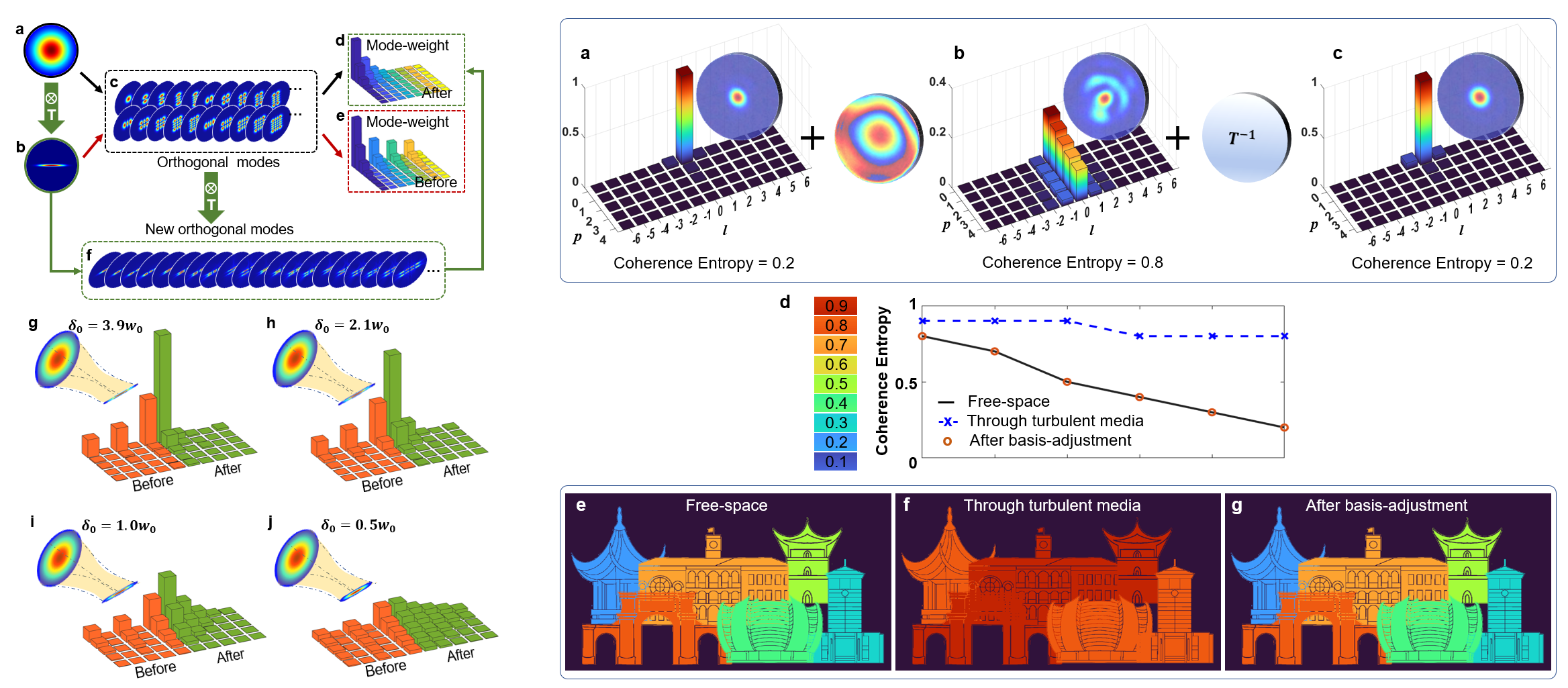 图3. (左)对比研究了自由空间聚焦系统及柱透镜形变系统中权重分布的演化与重建,揭示了基于合适空间基底分解时相干熵表现出的传输前后一致性;(右)利用相干熵实现复杂环境中信息编码传输。