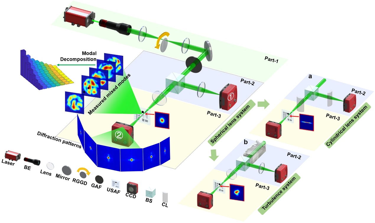 空间非相干光可由一系列电场模式非相干叠加描述:,其中为空间模式基底,为对应权重。当互为正交时,权重可由非相干正交模式分解计算。当光学系统变换矩阵为幺正矩阵时,传输前后的模式正交性可以被保证,这也是由正交偏振模式构建的矢量光场具备不变量的重要前提。该工作中,该课题组提出了基于多模式相干衍射成像算法的非相干光正交模式分解实验方案(如图2),揭示了幺正光学系统传输前后,非相干光各正交模式的权重相对分布将保持一致。