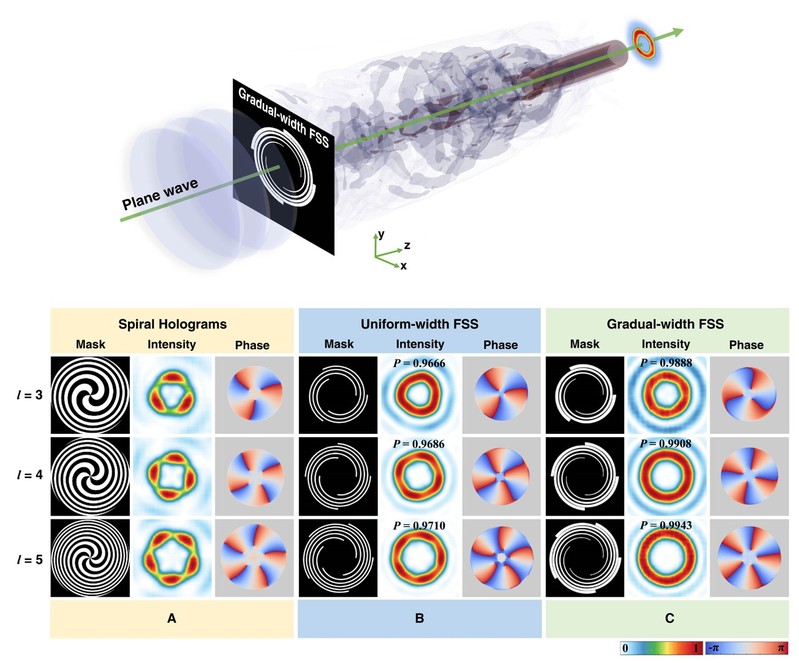 旋涡光束携带轨道角动量,因其具有这一额外的调控自由度,在许多光学领域具有重要的应用价值。因此,如何产生低成本、高质量的旋涡光束成为研究者普遍感兴趣的问题。最近91猫先生 赵承良教授团队结合传统费马螺旋狭缝和波叠加原理,提出了一种宽度渐变的新型费马螺旋狭缝结构,通过入射平面波即可在传输平面产生高质量的光学旋涡。相比于已有的二值化掩模和宽度均匀的费马螺旋线产生技术,该方案产生的旋涡光束质量大幅度提高,在拓扑荷数等于3时,光束纯度可以超过99%。该结构具有高加工容错率,利用激光打印机和透明胶片就可以实现打印,从而获得光束纯度大于98%的涡旋光束,该产生技术有望替代昂贵的微纳光学元件,更加经济和普适。此外宽度渐变的费马螺旋结构产生的旋涡光束具有更大空间范围的焦深,使得其在实际应用如光镊中的容错率更高。文章还揭示了具备这一优势的原因,即渐变宽度提供了特殊的混合态。该工作提出的低成本、高质量光学旋涡产生方法,在光通信、光学微操纵、纳米制造等领域具有重要的应用价值。国务院学位委员会学科评议组成员、国家级人才袁小聪教授还为此项工作点评,予以高度评价,认为该研究团队提出的低成本、高质量光学旋涡产生方法,在光通信、光学微操纵、纳米制造等领域具有重要的应用价值。