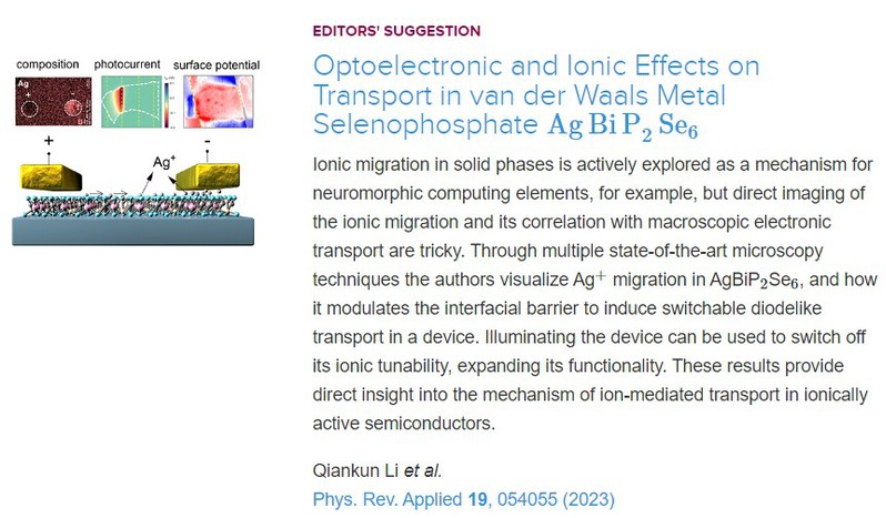 相关工作以“Optoelectronic and Ionic Effects on Transport in van der Waals Metal Selenophosphate AgBiP2Se6”为题发表在Physical Review Applied上,并被选为Editor’s Suggestion进行了亮点报道。物理学院硕士研究生李乾坤为文章的第一作者,方亮教授和游陆教授为论文的共同通讯作者。