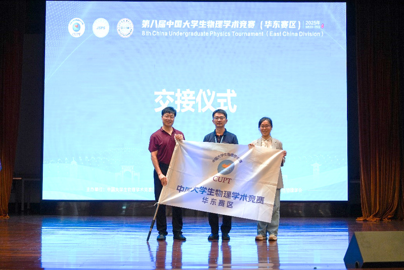 闭幕式上,还进行了庄重的赛旗交接仪式,竞赛旗帜顺利交接给下一届中国大学生物理学术竞赛(华东赛区)承办方福建师范大学。福建师范大学物理与能源学院陈水源副院长代表下届承办方发言,大赛圆满闭幕。