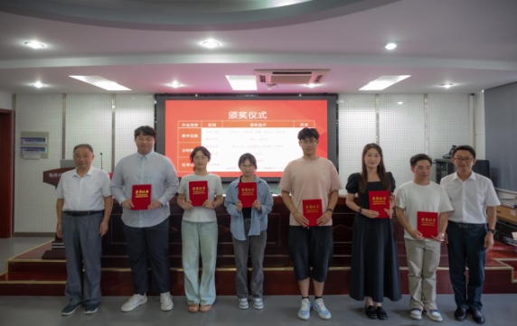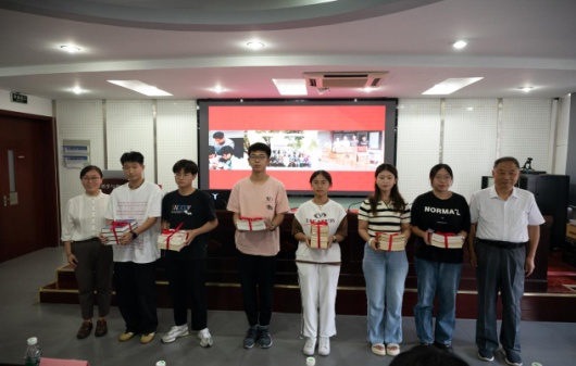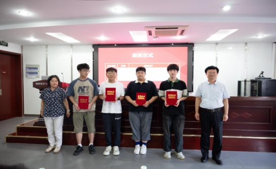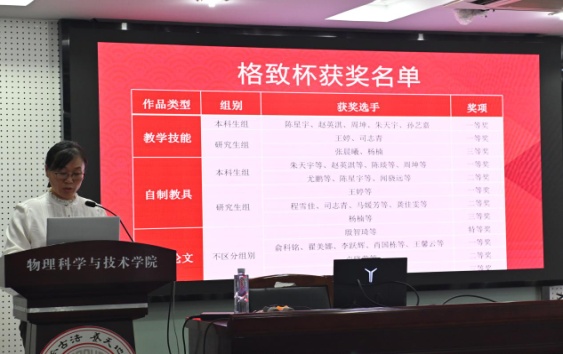 随后举行了“格致杯”颁奖仪式以表彰卓越,激励创新。“格致杯”物理师范生教学技能展评活动是全国物理师范生教学技能展评活动的重要赛事,今年学院本科生、研究生共 30 个项目参加比赛,获得教学技能展示一等奖 7 项;教具展示一等奖 5 项;优秀论文展示特等奖 1 项、一等奖 5 项;其他奖项多项。其中5 名参加教学技能竞赛的本科生全部获得一等奖。杨礼富书记和谢步时老师,桑芝芳教授和江山主任,须萍教授和蔡军校长分别为一、二、三等奖获奖者颁奖。获奖同学在教学技能、创新实验设计和自制教具等方面展现出卓越的创新精神,他们的成绩也体现了学院对师范教育高质量发展的长期重视和努力。