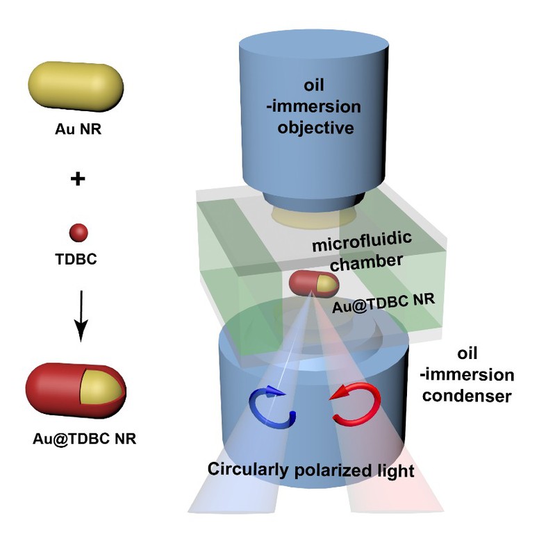分子的手性可以用光学方法定量检测,称为光学活性。局域表面等离激元是电子的集体振动,和手性分子相互作用,可以增强手性分子的光学活性。这种相互作用能够使手性特性转移到金属纳米颗粒上,从而通过共振耦合的机制被放大。