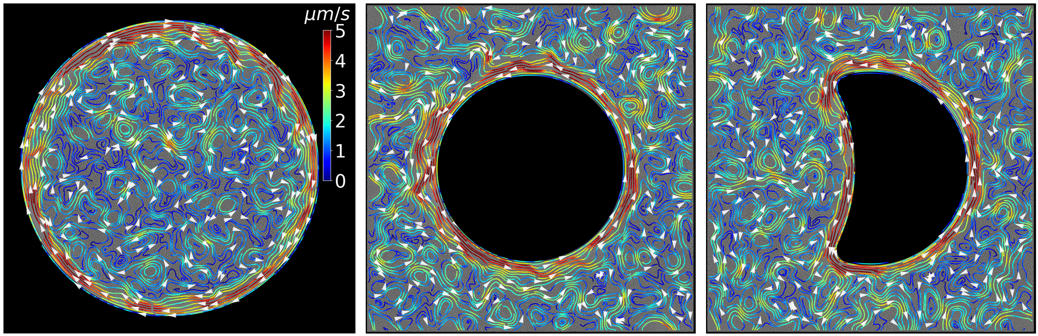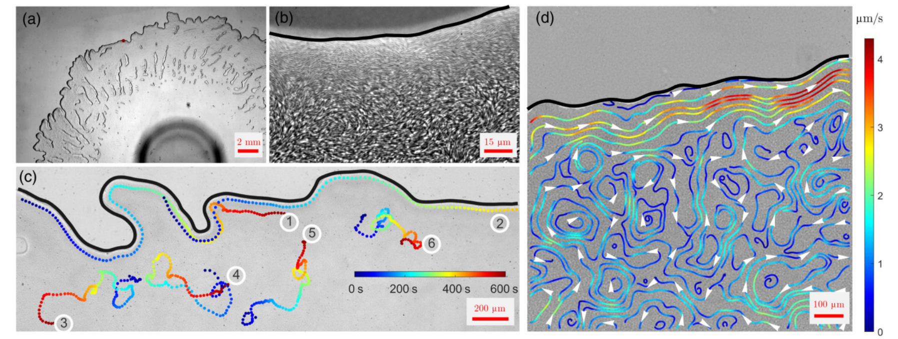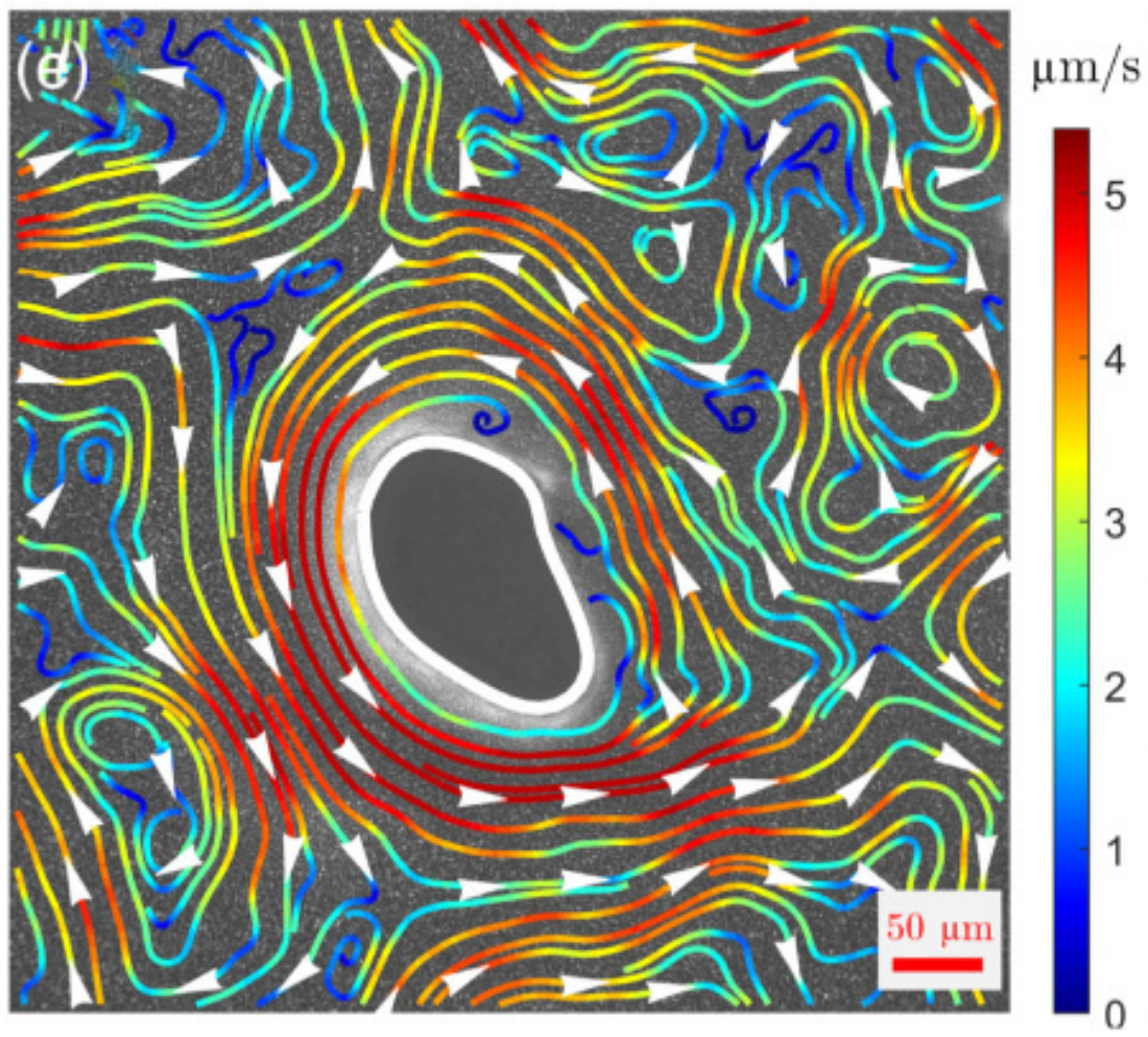 图1:Paenibacillus vortex菌落崎岖外边界超厘米级顺时针液流及其显微成像粒子流场示踪图(见a-d)以及内边界逆时针持续液流(见e)。