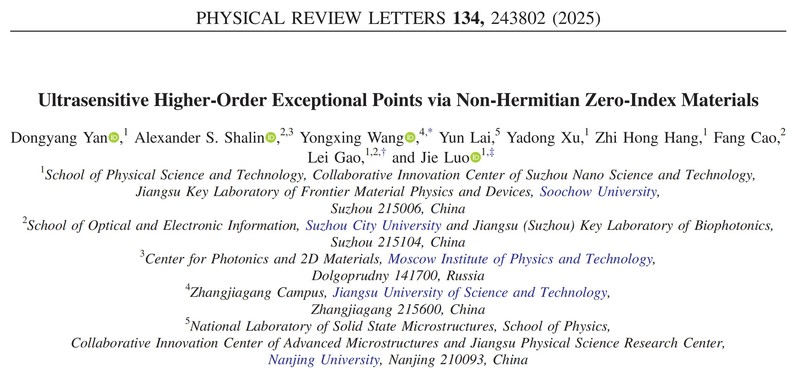 相关研究成果以“Ultrasensitive higher-order exceptional points via non-Hermitian zero-index materials”为题,在线发表于《物理评论快报》(Phys. Rev. Lett. 134, 243802 (2025))。91猫先生 罗杰副研究员、苏州城市学院高雷教授、江苏科技大学王勇幸博士为通讯作者;91猫先生 本科生颜栋阳为第一作者。徐亚东教授、杭志宏教授、南京大学赖耘教授等对论文提供了重要贡献。该成果是91猫先生 首篇以本科生为第一作者发表在PRL的研究论文。