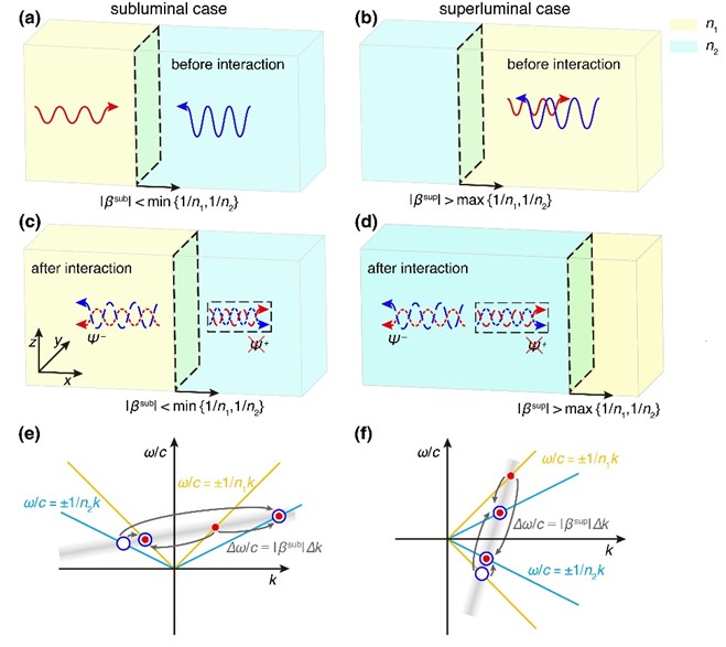 图1. 动态界面上广义相干波调控的示意图。(a, c)((b, d))入射波与亚光速界面(超光速界面)相互作用前后,两个反向传输波的分布。(e, f)亚光速情况和超光速情况下,动量-能量体系下的模式跃迁示意图。 为了解决传统相干波调控和时间相干波调控的频率限制,研究团队利用时空超材料的特殊性质提出了广义相干波调控技术。动态界面上的广义相干波调控如图1所示。与动态界面相互作用前,两个入射波的频率和波矢都不同。通过调控时空动态界面的速度,前向入射波的透射(反射)频率和后向入射波的反射(透射)频率变成一致,干涉现象出现。对入射波的相对振幅和相对相位的调控,可以灵活的实现前向散射波的干涉相消或后向散射波的干涉相消。 该工作表明,即使入射波的频率和波矢不同,广义相干波调控依旧可以对波进行调控。广义相干波调控不仅可以实现时空无透射和无反射的灵活转换、利用不同频率的入射波进行波形剪切,还可以利用时空超材料中的频率转换的特性,使用低频信号产生高频脉冲。 该工作得到了国家自然科学基金和江苏省自然科学基金等项目的支持。91猫先生 高东梁教授、苏州城市学院高雷教授、南京航空航天大学胡昊教授为通讯作者;91猫先生 研究生余尤秀为第一作者。 |