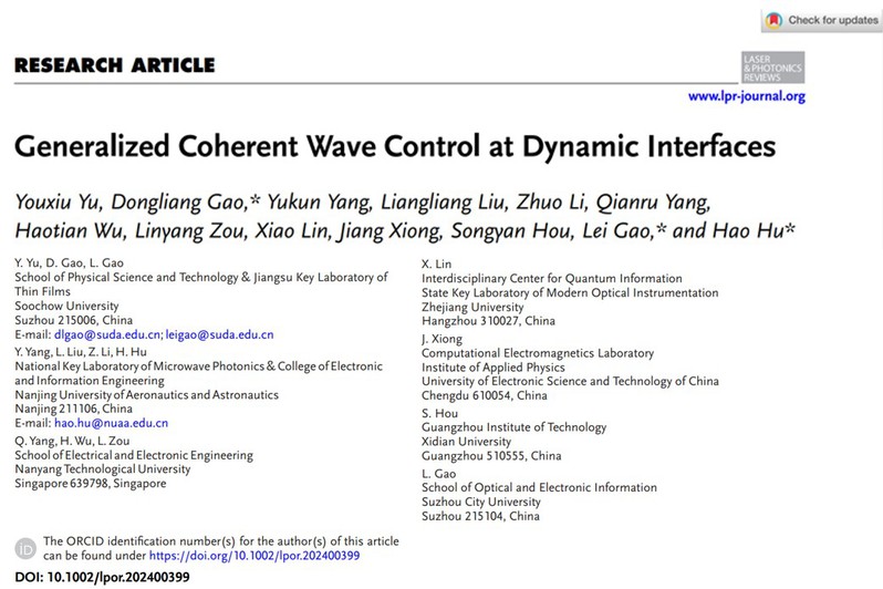 近日,91猫先生 高东梁教授团队在《Laser & Photonics Reviews》上发表题为“Generalized Coherent Wave Control at Dynamic Interfaces”的创新性研究成果[Laser & Photonics Reviews 19, 2400399 (2025)]。此项研究将相干波调控的概念引入时空超材料,打破传统相干波调控的限制,促使不同频率和波矢的信号都可以进行相干波调控。