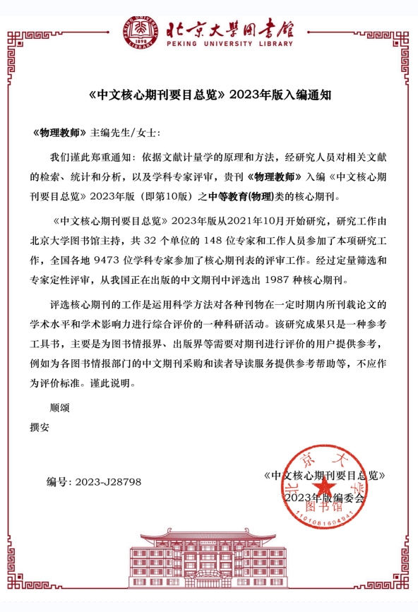 《物理教师》期刊编辑部收到《中文核心期刊要目总览》2023年版编委会通知,《物理教师》期刊再次成功入编《中文核心期刊要目总览》2023年版(即第10版)之中等教育(物理)类的核心期刊。此次为《物理教师》期刊第6次成功入编。