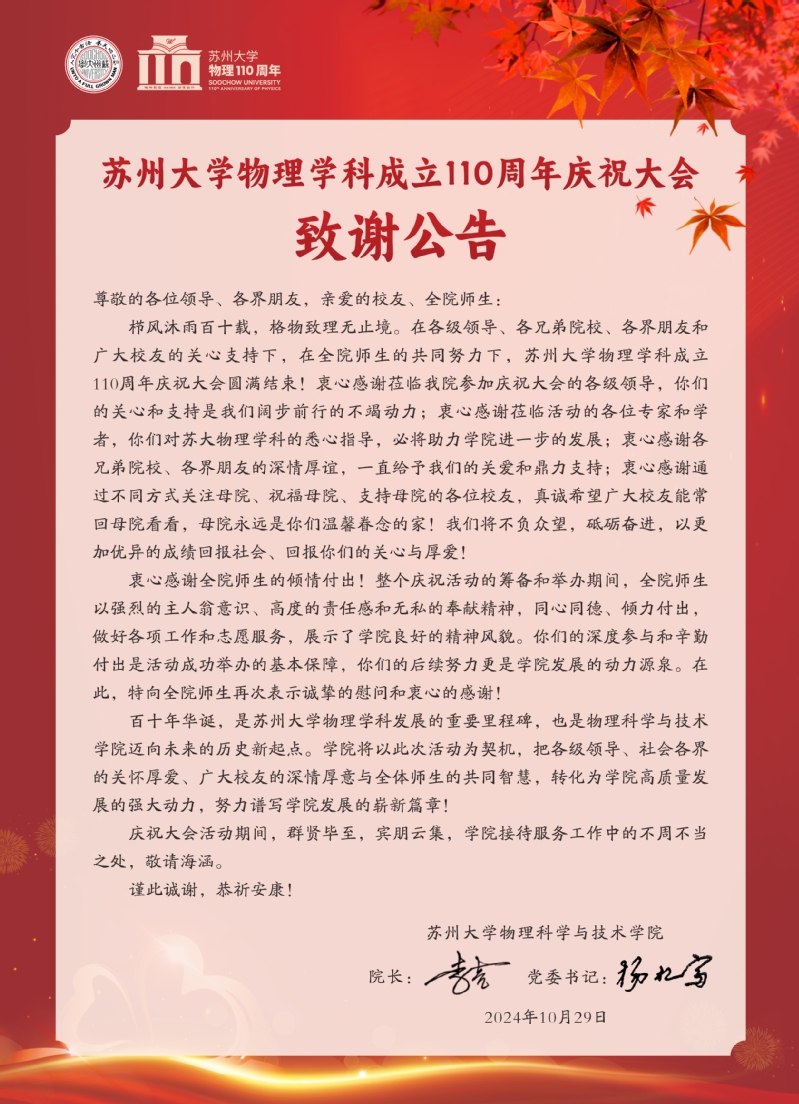 91猫先生 物理学科成立110周年庆祝大会致谢公告