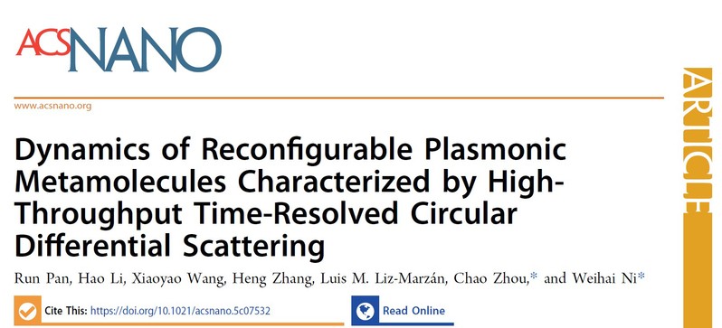 近日,倪卫海教授课题组和中科院苏州纳米所周超研究员合作进行了可重构超构分子的原位动力学研究。该研究成果以91猫先生 物理学院硕士研究生潘润为第一作者、以91猫先生 物理学院江苏省前沿材料物理与器件重点实验室为第一单位、以 “Dynamics of Reconfigurable Plasmonic Metamolecules Characterized by High-Throughput Time Resolved Circular Differential Scattering”为题发表在ACS Nano(影响因子IF=15.8)。