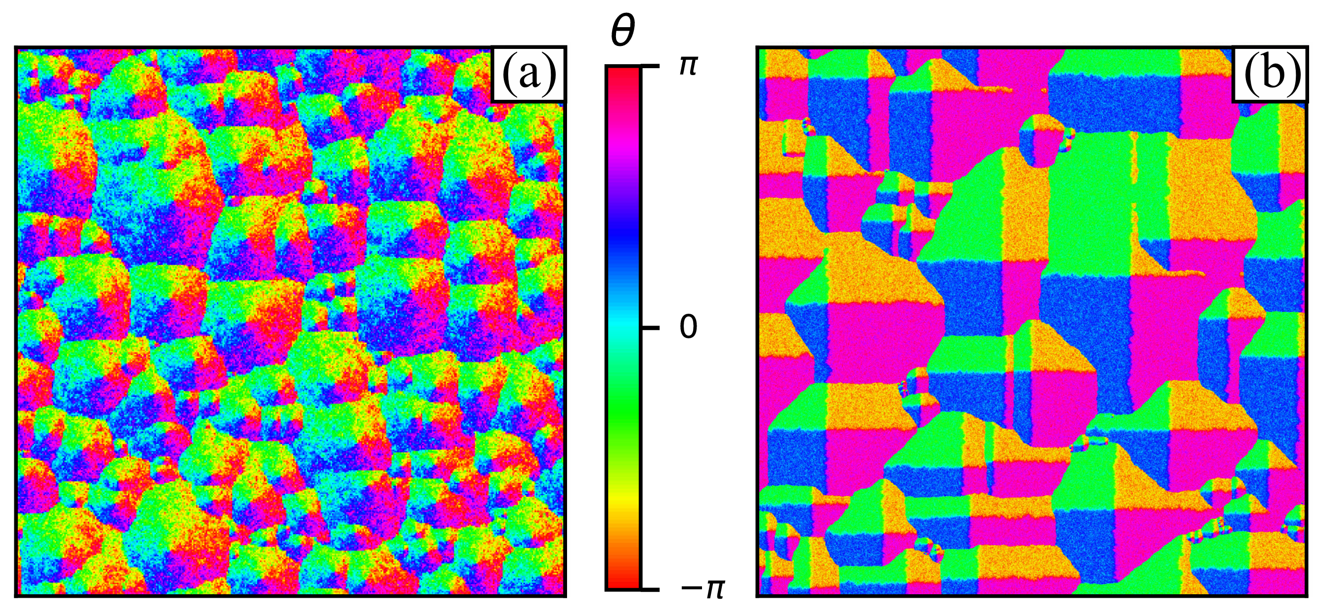 最关键的是,晶格结构总会破坏旋转对称性,导致有序方向被“钉扎”在晶格方向或对角线方向,涨落关联长度变为有限值,无法实现真正意义上的尺度不变性。这一发现意味着,非互易XY模型在宏观表现上更接近活性clock模型(active clock model),而非传统认为的具有无标度关联的极性群体。