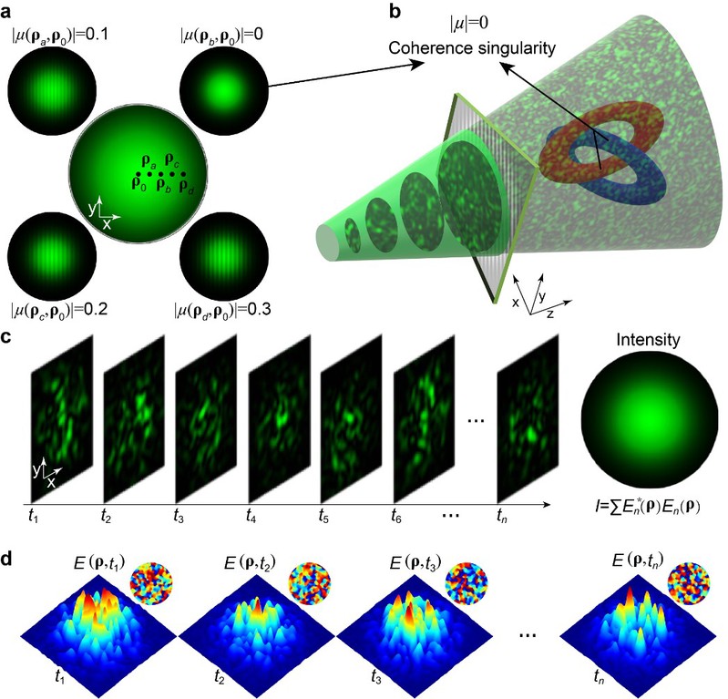 拓扑学作为研究几何结构在连续变形下不变量的理论,在流体动力学、量子场论、玻色-爱因斯坦凝聚等领域获得广泛应用,为高鲁棒性通信与数据存储提供了理论基础。其中,纽结是拓扑结构的典型形式,数学上定义为三维空间中闭合缠绕的曲线。此类结构不仅在数学中具有研究价值,也已在流体、液晶等物理系统中被观测到。2001年,Berry与Dennis 首次提出利用相位奇点构造完全相干光场中的稳定光学纽结,随后 Leach 等人通过拉盖尔高斯光束线性叠加实现了实验构建。此后,研究进一步扩展至偏振奇点与偏振纽结。然而,除相位与偏振外,相干性同样是光场的重要属性。相干奇点作为统计特性中的奇异结构,表现为与参考点相干度为零的位置,虽强度不为零却无法形成干涉条纹。图1展示了随机散斑光形成的非相干光场,其瞬时场随机但统计分布均匀。目前,由相干性调控引起的光学奇点及其对应的三维拓扑结构光场调控尚未得到系统研究。
