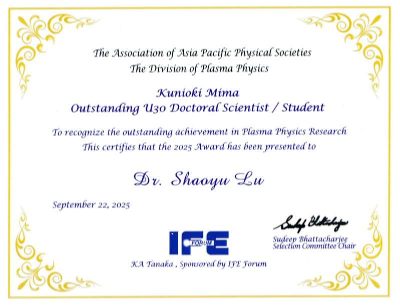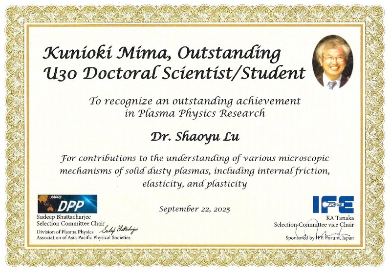 卢少瑜荣获亚太等离子体物理U30青年科学家奖