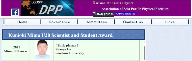 亚太等离子体物理“U30青年科学家奖”设立于2018年,每年颁发给在等离子体物理领域做出创新性研究成果的优秀青年学者(30岁以下)。该奖项的评选委员会由亚太和欧美的等离子体物理专家组成。2025年共评选出六位U30青年科学家,卢少瑜是基础等离子体方向唯一的U30获得者。