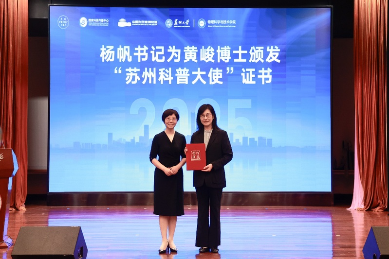 苏州市科学技术协会党组书记杨帆为黄峻博士颁发“苏州科普大使”证书。