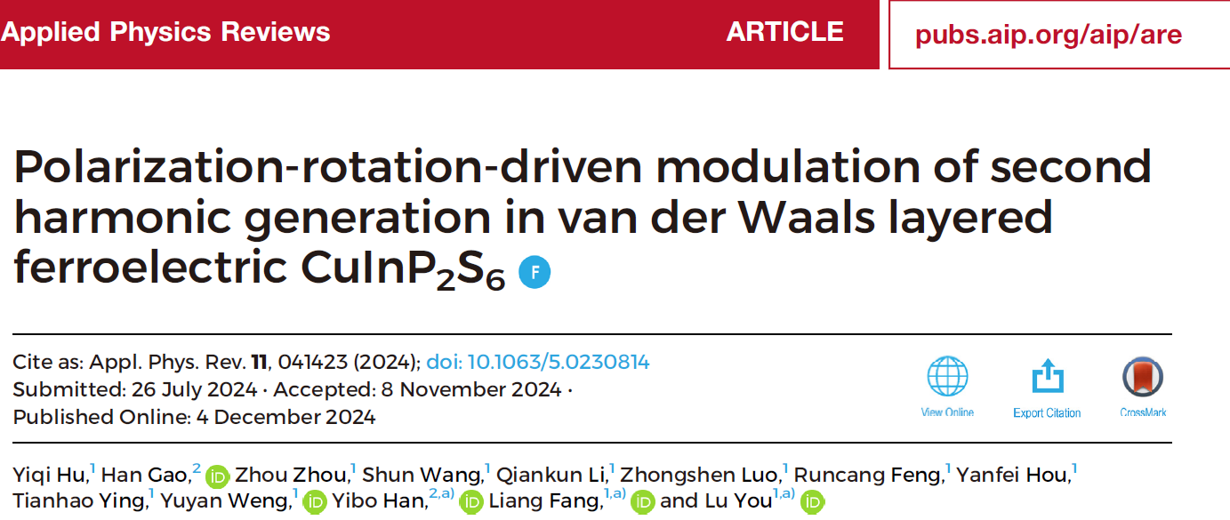 这一研究成果以“Polarization-rotation-driven modulation of second harmonic generation in van der Waals layered ferroelectric CuInP2S6”为题发表在应用物理顶级期刊Applied Physics Reviews上,并被选为Featured Articles。91猫先生 物理学院博士生胡一奇、华中科技大学博士生高寒为文章的共同第一作者,91猫先生 物理学院方亮教授、游陆教授,华中科技大学物理学院韩一波教授为论文的共同通讯作者。以上工作获得了国家自然科学基金委面上项目和苏州科技局项目等的支持。