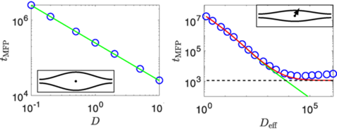 该研究首先发现管道中的活性粒子动力学方程无法用单一的熵势约化。在扩散极限下,活性粒子的密度场仍可以用熵势约化,但由于活性粒子的边界聚集效应,活性在改变了有效温度的基础上同时改变了管道的有效宽度,使得活性粒子熵势无法从布朗粒子熵势中简单推广得到。文章进一步展示了如何利用活性粒子熵势来计算粒子从纺锤形管道中逃逸的平均时间,并展示了取向场熵势如何用于定性预测不对称管道中的自发粒子流场。这些粒子展示了推广的Fick-Jacobs方程的实用性。