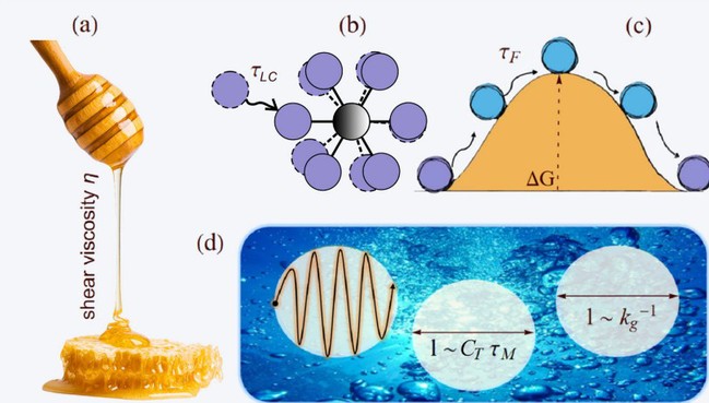 当蜂蜜缓缓流出汤匙,当机油在引擎内承受高温,人们习以为常的“黏稠”背后究竟发生了什么?自牛顿1687年在《自然哲学的数学原理》中写下剪切应力与剪切速率的比例关系,黏度便成为描述流体力学的基石概念之一,然而,这一宏观表达式并未触及其微观物理图像。气体可用动理论描述,即原子(或分子,下同)碰撞传递动量,黏度与温度平方根成正比;但液体原子密集,相互作用势场重叠,导致传统的原子碰撞的物理图像失效。20世纪30年代,Eyring提出化学动力学形式的黏度公式,却留下预因子与活化能两个待定参数。随后40年代,Frenkel将液体原子的运动视为短时间类似固体原子振动与长时间在局部势阱间跳跃这两种运动的综合,这虽然给出了直观的物理图像,但却未能给出定量化的参量。此后约八十年,作为流体输运系数,液体黏度的微观表达式始终“缺席”,液体复杂的微观结构和集体动力学使得理论计算其黏度的努力一直步履维艰。诺贝尔奖得主温伯格曾一针见血地指出:计算水的黏度,其难度堪比推演塑造宇宙的基本常数。朗道也曾说:几乎不可能推导出任何能定量描述液体性质的一般公式。因此,液体的黏度微观机制至今仍是困扰科学界的谜题之一。
