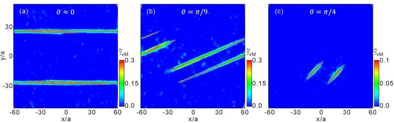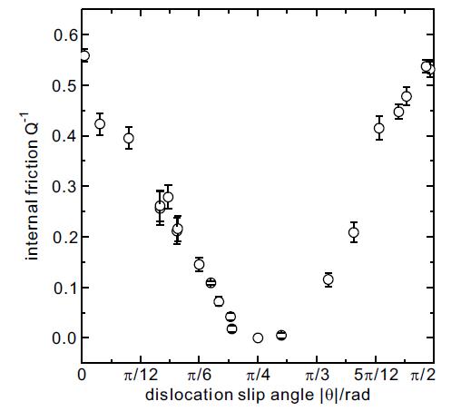 本文通过计算机模拟,系统地研究了二维尘埃等离子体固体位错内耗的微观物理机制。在周期性剪切形变过程中,通过计算位错沿不同晶格取向运动时的应力应变响应关系,发现损耗因子随位错滑移方向与剪切方向间夹角的变化规律,如下图所示。当错滑移方向与剪切方向的夹角从0逐步增大至π/2时,损耗因子先减小后增大,近似对称分布,尤其是夹角为π/4时,对应的损耗因子为零,即没有内耗产生。这一结果充分表明,位错内耗明显依赖于系统的晶格取向。