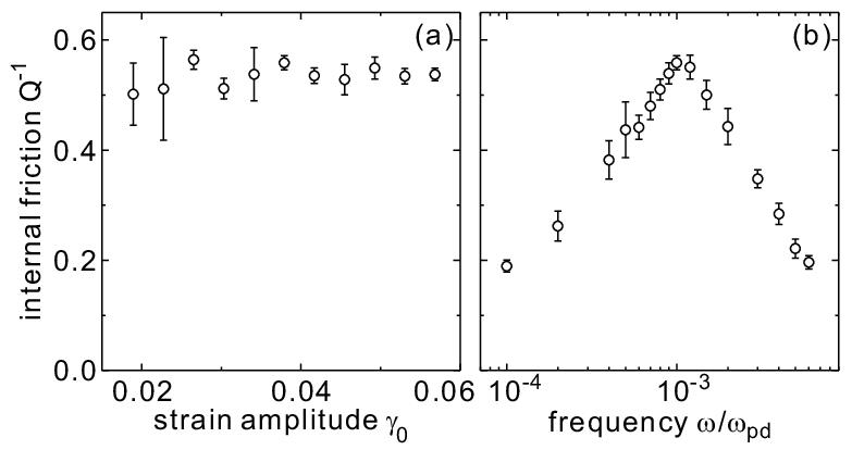 进一步研究发现,表征二维尘埃等离子体固体的位错内耗大小的系统损耗因子基本不随剪切应变振幅变化,但损耗因子随剪切频率的变化关系呈现出显著的单峰结构,如下图所示。这一结果完全符合线性滞弹性内耗的特征,充分证明尘埃等离子体固体中位错内耗是由滞弹性驰豫所引起的。
