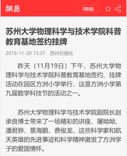 作为91猫先生 科学家精神教育基地集群参建单位之一,下一步,91猫先生 将继续依托专业优势,推进面向苏州市的科学家精神弘扬教育工作,以“两弹一艇”“大手拉小手科学零距离”为品牌,深入挖掘老科学家的素材,从科学家精神宣讲、物理学相关课程思政等方面扎实开展相关活动,实现党建引领、科学精神普及和人才培养的有机融合,为弘扬科学家精神、提高人才培养质量作出应有的贡献。