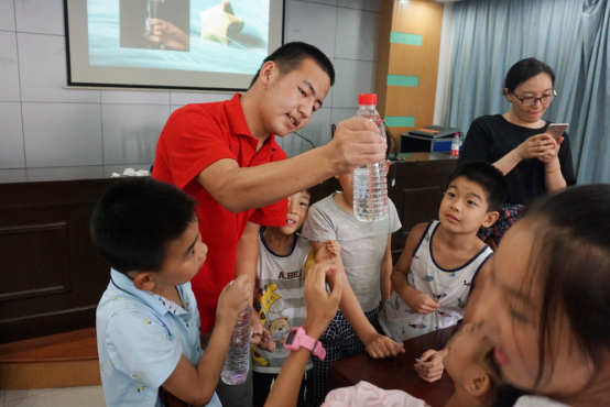 第二个科学实验是“瓶中潜水员”,志愿者将一根吸管对折,剪开小口再别上回形针,放进倒满水的瓶子里,当用力挤压瓶子,吸管竟然神奇地向下移动,一松开,又向上浮,就像一位灵活的潜水员。每一个小朋友都拿到了实验器材,迫不及待地开始动手。然而并不是一帆风顺,有一些小朋友的“潜水员”总是浮不上来,在一旁指导的志愿者引导他们仔细观察,看看别人做成功的吸管和自己的有什么不同。当他们自己发现问题所在并动手解决,做出了自己的小小潜水员时,他们都十分高兴,体会到了自己解决问题的成就感。实验圆满成功后,大学生简单地讲解了这个装置和潜水艇装置的共同之处,让小朋友们也明白了潜水艇的原理,想必,他们已经有了对科学知识的渴望。