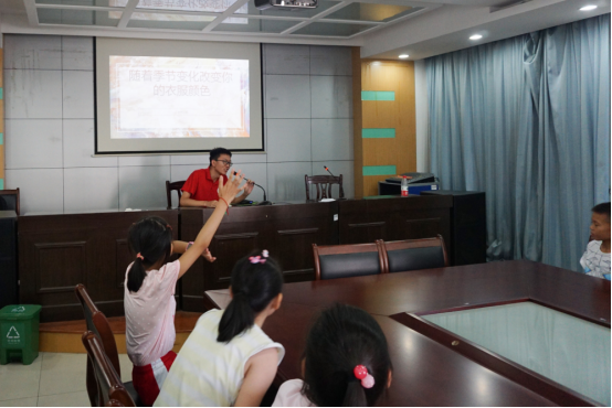 “这和我们今天要讲的知识就有关联了,为什么我们周围的世界有那么多颜色呢?为什么我们穿的衣服也会多色多彩呢?”这两个问题牢牢地抓住了在场小朋友们的心,他们放下手中的盘子,牢牢盯着讲桌前的大学生,盼望着能一探究竟。自然组的同学运用图片演示,说明了简简单单的白光实际由七种单色光组成,分开之后便是绚烂的彩虹。我们看到的物体颜色其实是由它反射特定颜色的光形成的。接着介绍衣服与季节的联系,如深色衣服吸热强,浅色衣服吸热弱,他们还从衣服颜色与心情之间的联系做了联系,深入浅出,层层递进。小朋友和家长们都听得津津有味,不时还观察自己和周围人的衣服颜色,并记录下每个季节穿衣颜色要点,脸上露出纯真的微笑,一副跃跃欲试的架势,大概在想回家后要好好当一次家人朋友的小老师,好好炫耀一下。