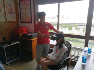 最后,科普组同学拿着VR眼镜让小朋友们尝试,神奇的视感让小朋友们对虚拟现实技术充满了求知欲。在虚拟的世界中,你能看到电影里的东西、人物,也能看到电影里没有的,只要想得到,虚拟现实技术都可以让你看到。