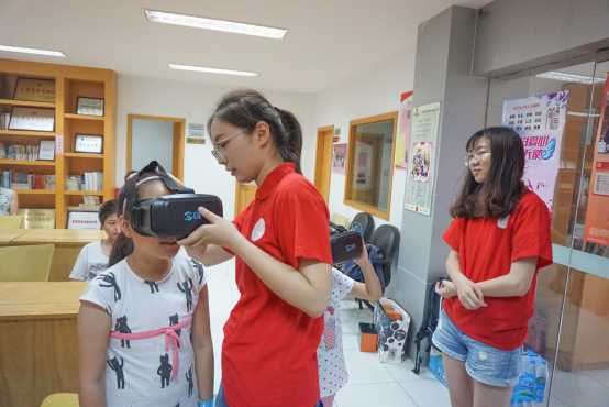 第二节课,由科普探究组给孩子们介绍虚拟现实技术。首先,科普组的同学简单介绍了虚拟现实技术的产生和应用,接着就拿出两台VR眼镜给孩子们体验,孩子们显然对VR产生了极大的兴趣,一个个争先恐后地想要体验VR设备的奇妙。在VR设备里孩子们体验了刺激的过山车和梦幻的海洋世界,观看完后意犹未尽地和旁边的小伙伴们讨论自己看到的影像。趁着他们的好奇心,科普组的同学用简单的小模型解释了人眼的立体视觉原理和VR设备的原理。最后向孩子们介绍了模拟环境、感知、自然技能和传感设备等VR的名词。孩子们通过这堂课,感受到了科技的魅力,并且对虚拟现实技术有了初步的了解。