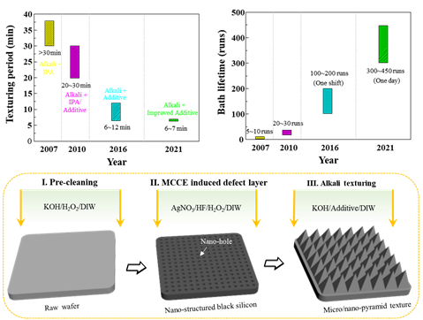 图一:单晶太阳电池碱制绒工艺发展趋势(上图);超快速制绒技术示意图(下图)