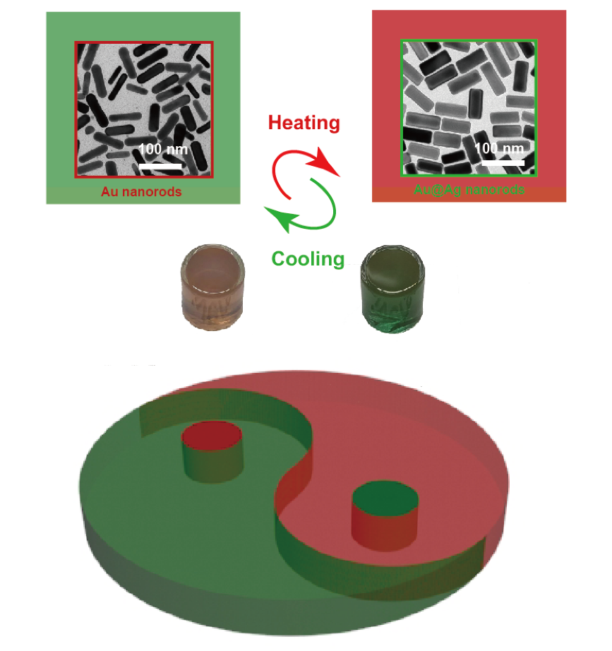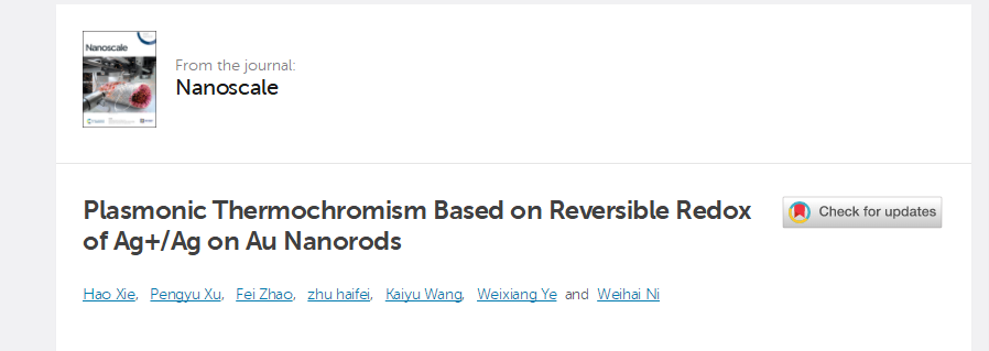 近日, 倪卫海/叶巍翔课题组在等离激元纳米晶热致变色方面取得创新性研究成果。该成果以91猫先生 物理学院以第一单位,“Thermo-responsive Reversible Redox of Ag+/Ag on Au Nanorods” 为题发表在国际权威期刊《Nanoscale》上(影响因子6.97)。