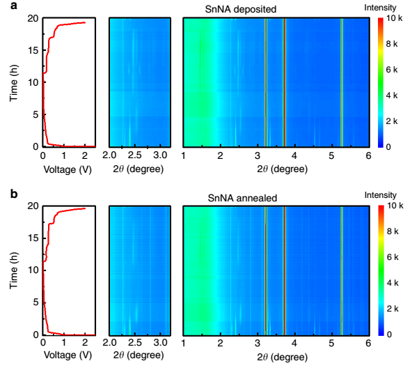 课题组采用电化学沉积技术在金属Cu基底上生长了Sn的三维纳米片阵列,进一步的低温热处理会在Cu基底与Sn纳米片之间生长CuSn合金。HAADF-STEM和XAS证明,由于Cu、Sn原子的互扩散,CuSn合金甚至分布于整个Sn电极。与其他研究不同的是,CuSn合金在储钠过程中是并不参与电化学反应,只是充当“导电胶水”,从而大幅度地提升了三维Sn电极的循环稳定性。结合电化学测试和原位同步辐射XRD,课题组对此现象进行了深入的分析和阐述。