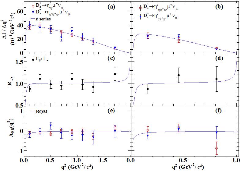 标准模型中轻子普适性要求三代轻子(电子,缪子和陶子)与规范玻色子具有相同的耦合强度。任何轻子普适性破坏的现象都暗示着超出标准模型的新物理的存在,因此精确检验轻子普适性是近年来粒子物理的前沿课题之一。粲介子半轻衰变包含电子或者缪子,是检验缪子-电子轻子普适性的理想窗口。基于BESIII实验在束流质心能量4.128至4.226 GeV范围内采集的积分亮度7.33 fb-1的正负电子对撞湮灭数据,在理论预言三十多年后,首次在实验中观测到Ds+→η'μ+νμ半轻衰变,并研究了其运动学性质,衰变分支比的测量精度比此前最好的结果改进了6倍,以当前世界最高精度精确检验了奇异粲介子衰变中的电子-缪子轻子普适性,未发现普适性破坏迹象。此外,通过研究该衰变过程的动力学性质,该工作还测量了形状因子与CKM矩阵元Vcs的乘积以及不对称参数。下图展示了Ds+→η'μ+νμ衰变分宽度拟合,轻子普适性检验和前后倾不对称参数的测量结果。该工作对于检验微扰-非微扰QCD有效理论,CKM矩阵元幺正性以及提高格点QCD对形状因子的计算精度具有非常重要的作用。