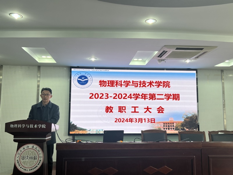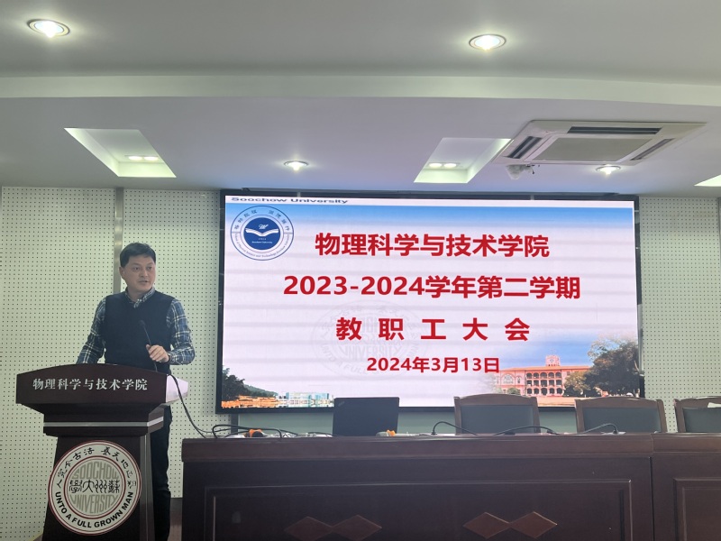 杨礼富书记向学院全体教师传达了校党委十三届四次全会及全校干部大会的会议精神。杨书记指出,2024年学校将着重做好学科建设、人才培养、人才队伍建设、科研攀峰、国际合作、内部治理、平安校园建设等十个方面的工作,学院也将紧紧围绕这些工作要点开展工作,同时围绕物理学科110周年庆祝活动,通过举办学术交流、校友联谊、高质量发展大会等系列庆祝活动谋划苏大物理学科发展的崭新篇章。同时对全体教师就新学期提升教学科研水平、做好意识形态工作和校园安全稳定工作等方面提出了具体要求。