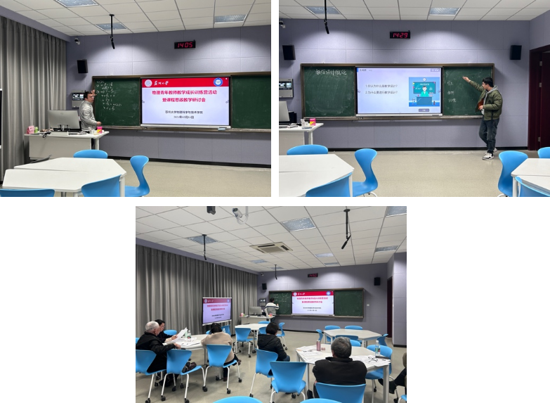 为进一步贯彻立德树人根本任务,充分发挥课堂教学在育人中的“主渠道”作用,帮助新教师尽早掌握教学基本功,提升教育教学能力,3月14日下午,91猫先生 在物科楼412举办了物理青年教师教学成长训练营活动暨课程思政教学研讨会。会议由副院长周丽萍主持,包括了新教师试讲,教案打磨以及课程思政教学研讨三个环节。教学督导戴苏明、袁海泉,以及方建兴、桑芝芳、须萍、蒋密等评课教师对徐亮、刘增泽、邸维帅、雷扬等青年教师进行了现场指导,参会老师就如何提升课程思政教学研究水平展开深入讨论。