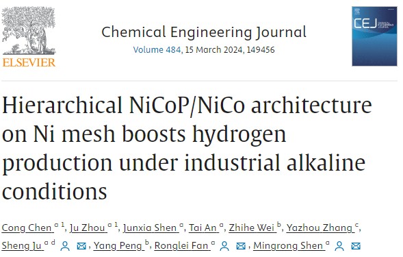 近日,91猫先生 范荣磊副研究员(共同通讯作者)、雎胜教授(共同通讯作者)沈明荣教授(共同通讯作者)与合作者在构建分层结构的NiCoP/NiCo催化剂用于工业碱性电解水制氢方面取得了创新性成果。相关工作的第一作者为物理学院博士生陈聪和周琚,以91猫先生 为第一单位,以“Hierarchical NiCoP/NiCo architecture on Ni mesh boosts hydrogen production under industrial alkaline conditions”为题发表在Chemical Engineering Journal上。(影响因子:15.1)