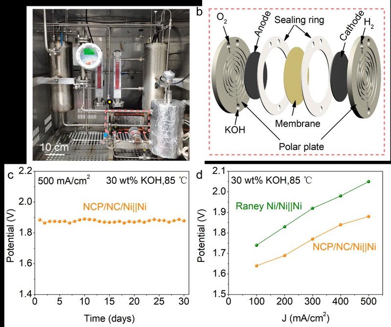 本工作在Ni网表面制备分层结构的NiCoP/NiCo(NCP/NC)催化剂。实验和理论计算表明,优异的HER性能得益于非晶NCP的高本征活性,以及NC多功能层。微米锥状的NC缓冲层不仅可以暴露出更多的催化活性位点,还能加快荷质传输。此外NC缓冲层能够释放Ni网和NCP催化剂间的界面应力,进一步提升电极的稳定性。当和Ni网阳极组成碱性电解水装置时,NCP/NC/Ni||Ni电解池在30 wt% KOH,85℃的条件下,驱动500 mA cm-2的电流密度仅需1.88 V,远优于工业用的Raney Ni/Ni||Ni(2.05 V)。该工作为设计高效稳定的工业碱性电解水催化剂提供了新思路。