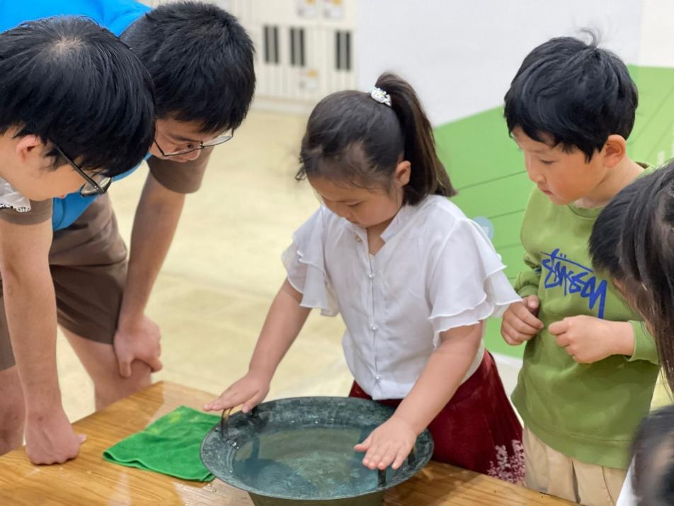 之后小朋友们亲自动手体验仪器,在志愿者们的指导与耐心解答下,同学们上手体验到了鱼洗的奇妙,忍不住瞪大双眼去观察和思考,逐渐对科学实验有了更深刻的见解,在科普实验的过程中,志愿者们一步步地引导学生们产生了对科学的浓厚兴趣。