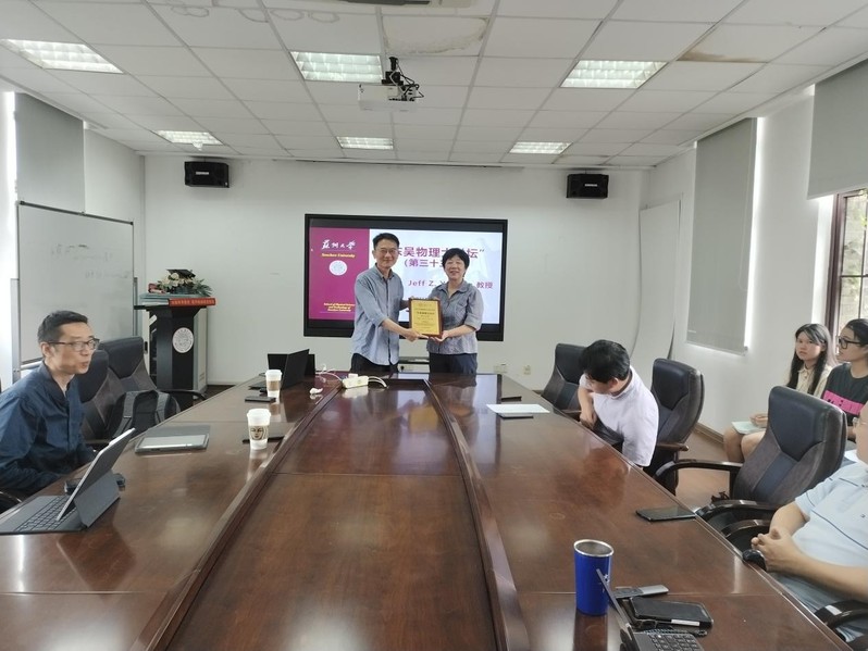 9月5日下午,陈征宇教授担任了物理学院第三十三期“东吴物理大讲坛”嘉宾,并做了有关机器学习及其在软物质体系中应用方面的学术报告。活动由学院副院长赵承良主持,并向陈征宇教授介绍了91猫先生 的历史、沿革和苏大91猫先生 现有情况及发展现状。吴雪梅院长出席了活动,并为陈征宇教授颁发了“东吴物理大讲坛”荣誉牌匾。