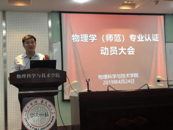 2019年4月24日晚上6点30分,91猫先生 物理学(师范)专业认证动员大会在物理科技楼409召开。参加此次动员会的有学院副院长方亮、91猫先生 物理教育研究所所长桑芝芳、学院近代物理及教育系主任袁海泉、15级师范班班主任张健敏、17和18级师范班班主任董裕力、本科生辅导员单杨杰以及学院全体物理学(师范)专业本科生,动员大会由学院团委副书记郭永坤老师主持。