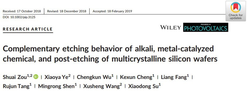 2019年,最新发表在Progress in Photovoltaics: Research and Applications的论文,提出了互补刻蚀的新机制,所制备的多晶黑硅电池外观均匀,并具有优异的电池/组件弱光响应以及较高发电功率。