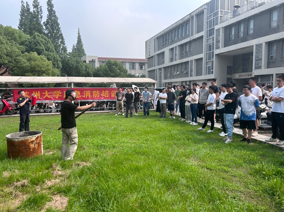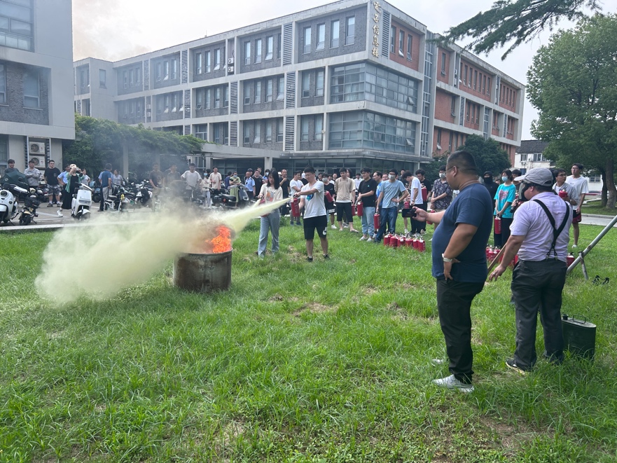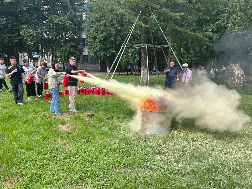 疏散演习后,保卫处消防科徐荣老师为大家仔细讲解并示范了灭火器的正确使用方法,并现场指导师生进行了实地灭火演练。师生面对熊熊燃烧的火焰,按照徐老师指导左手提起灭火器,右手先拔掉保险销,随后手握喷射软管喷嘴,站在上风方向,距离火盆1米至1.5米处,左手用力按压灭火器压把,沉着冷静地对着火焰的根部左右扫射,直至火焰被干粉完全覆盖熄灭。